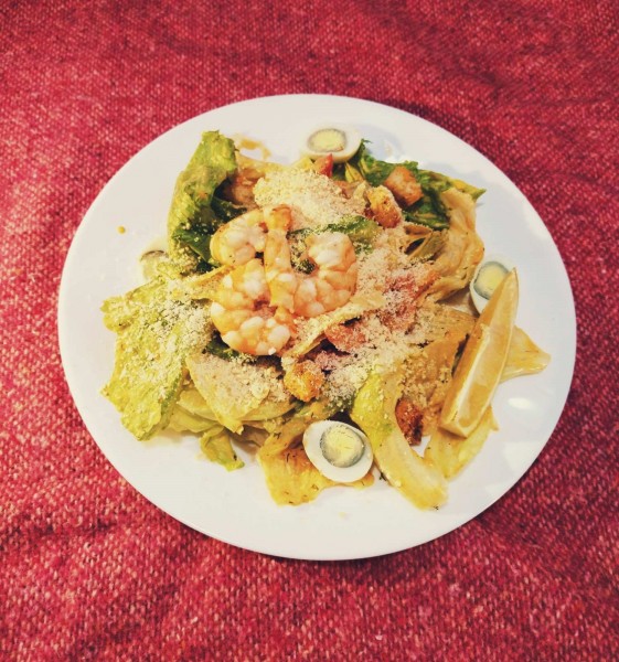 черрі, креветки, салат айсберг, яйце перепелине, сир пармезан, сухарі.
